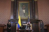U.S. Homeland Security Secretary Kristi Noem, at table on right, and Colombian Foreign Minister Laura Sarabia sign a Biometric Data Sharing Program Letter of Intent in Bogota, Columbia, Thursday, March 27, 2025. (AP Photo/Alex Brandon)