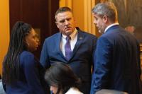 Speaker of the House Don Scott Jr., D-Portsmouth talks to Gianni Snidle and Del. Dan Helmer, D-Fairfax, Wednesday, April 2, 2025, in Richmond, Va. (Margo Wagner /Richmond Times-Dispatch via AP)
