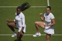 Aryna Sabalenka of Belarus, right, and Coco Gauff of United States dance during a practice session ahead of the Wimbledon Championships in London, Friday, June 27, 2025. (AP Photo/Kin Cheung)